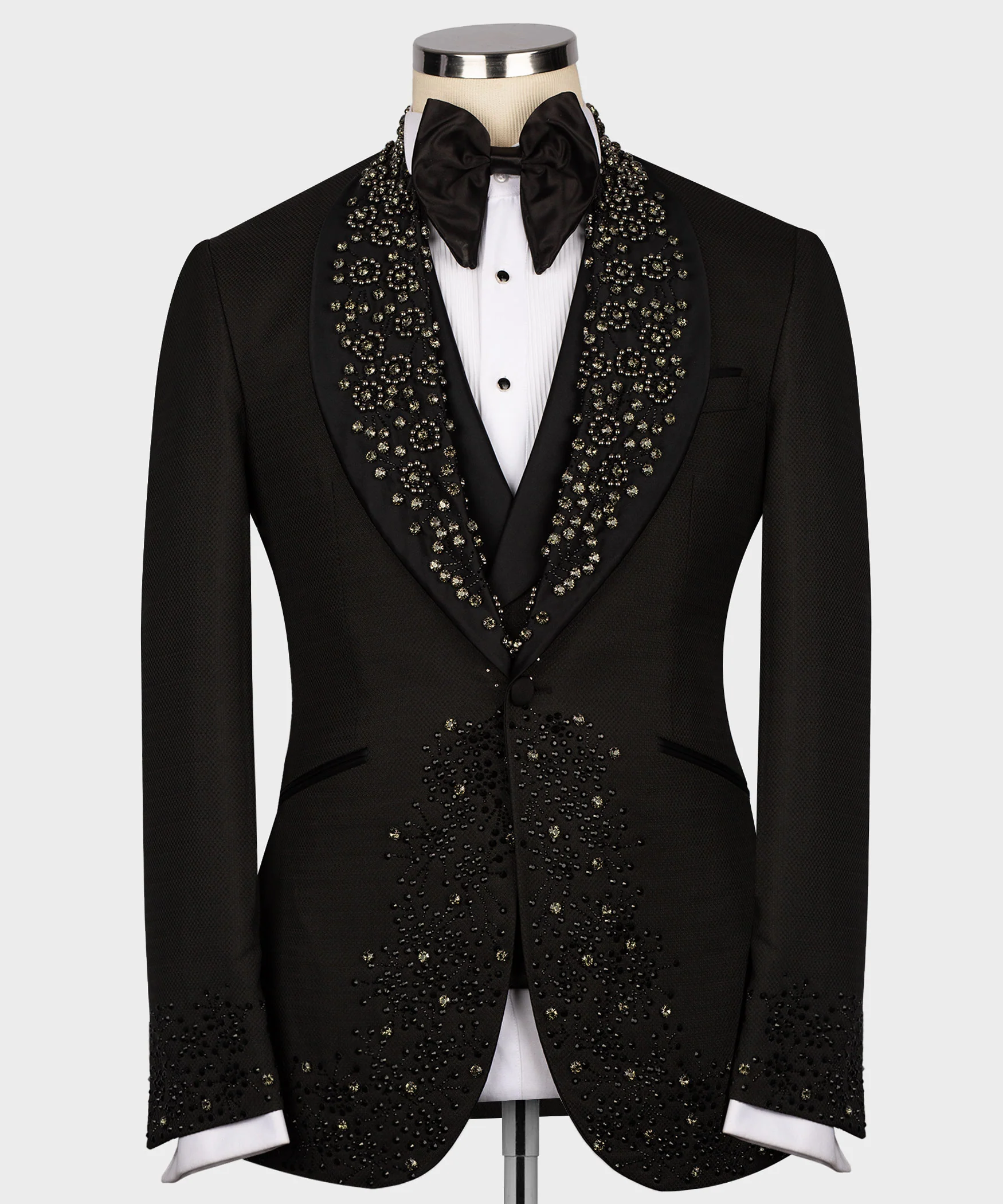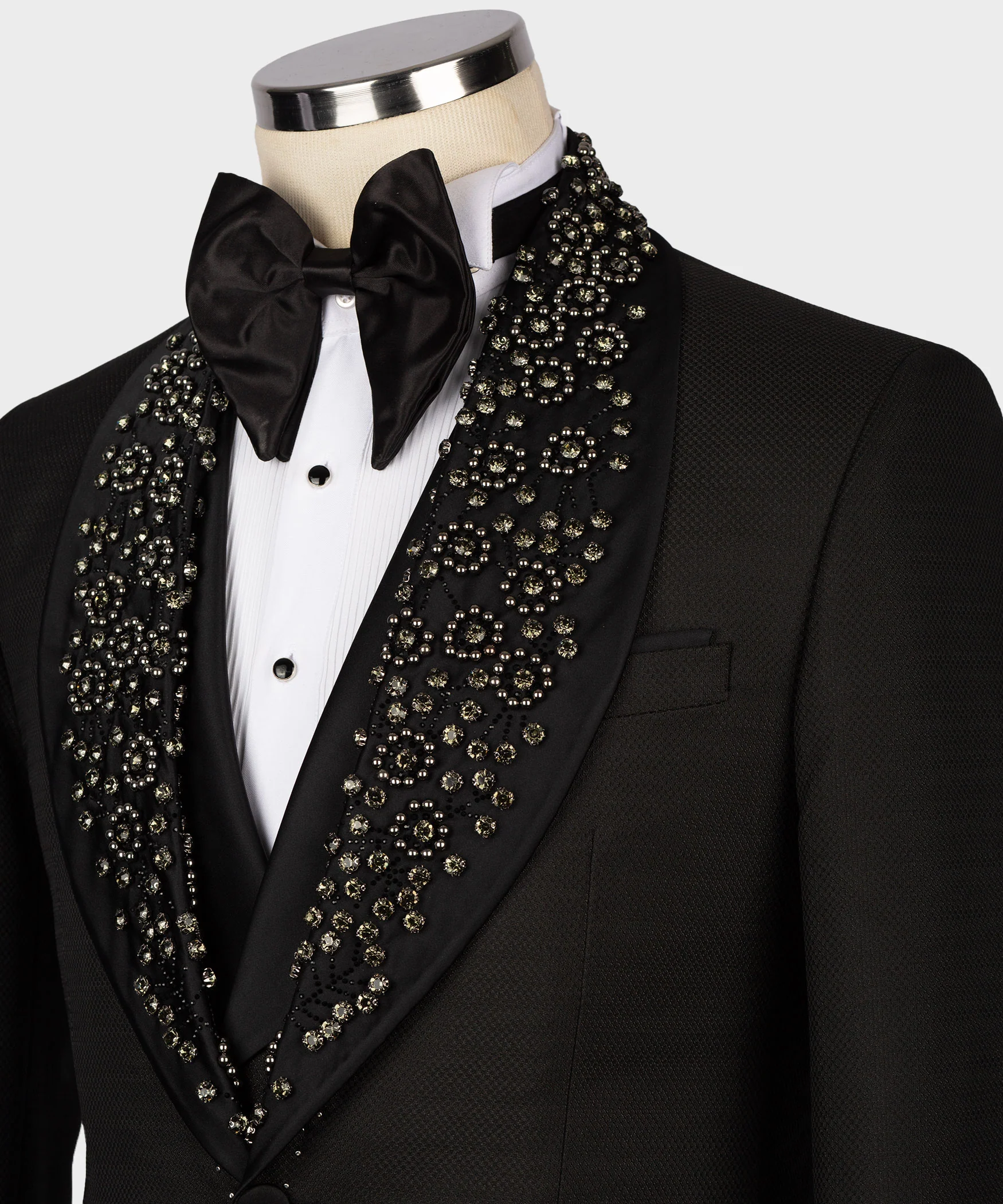 Exclusive custom tuxedos allow you to experience comfort and elegance together. White-Black Gem stone White Tuxedos from SB Suits collections. Made of Silk and Wool with one button, two back Slits, Black tuxedo trousers. Can be made in any size (takes three day) by Custom Orders. Suit contain Jacket, waistcoat and Trousers.