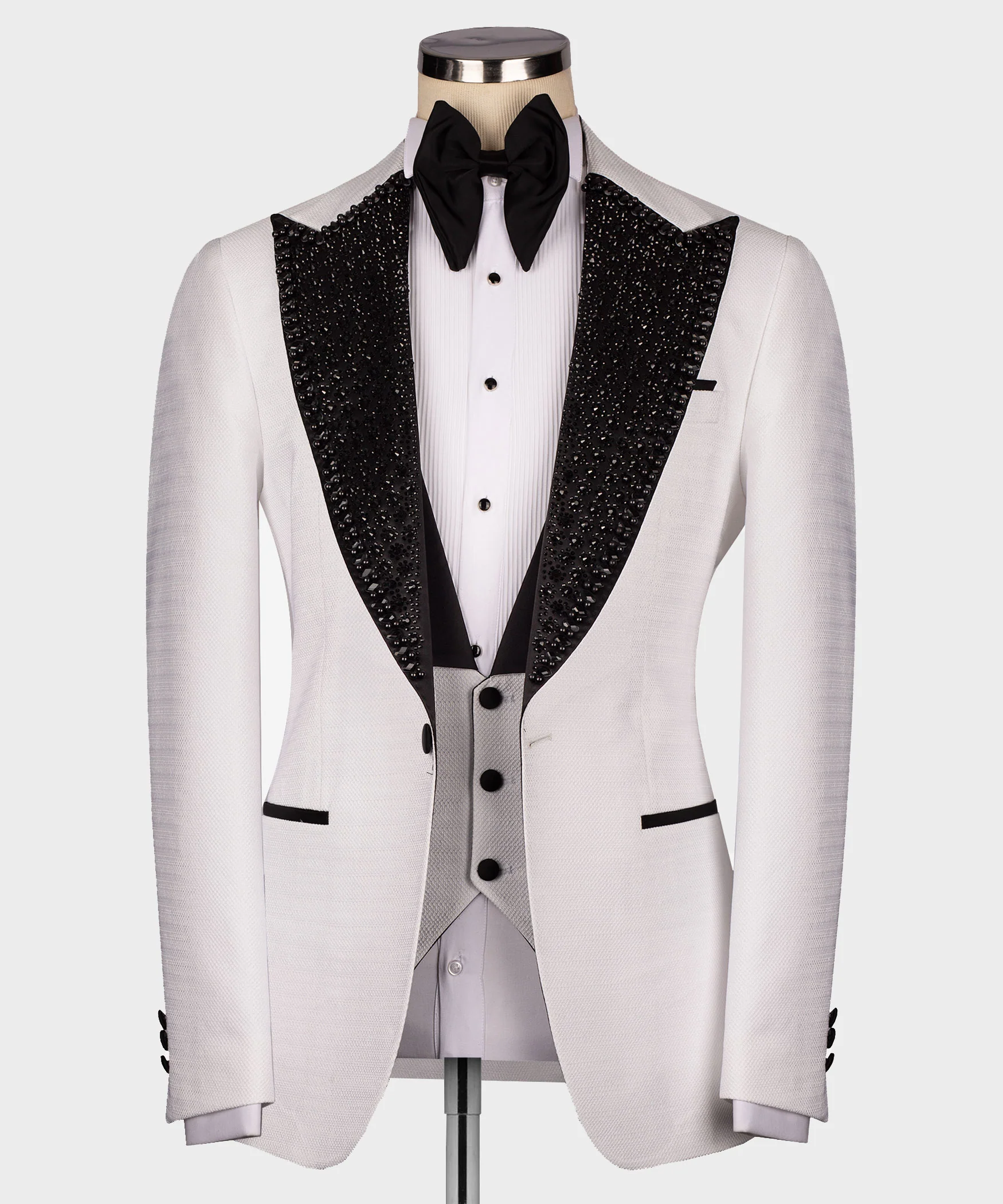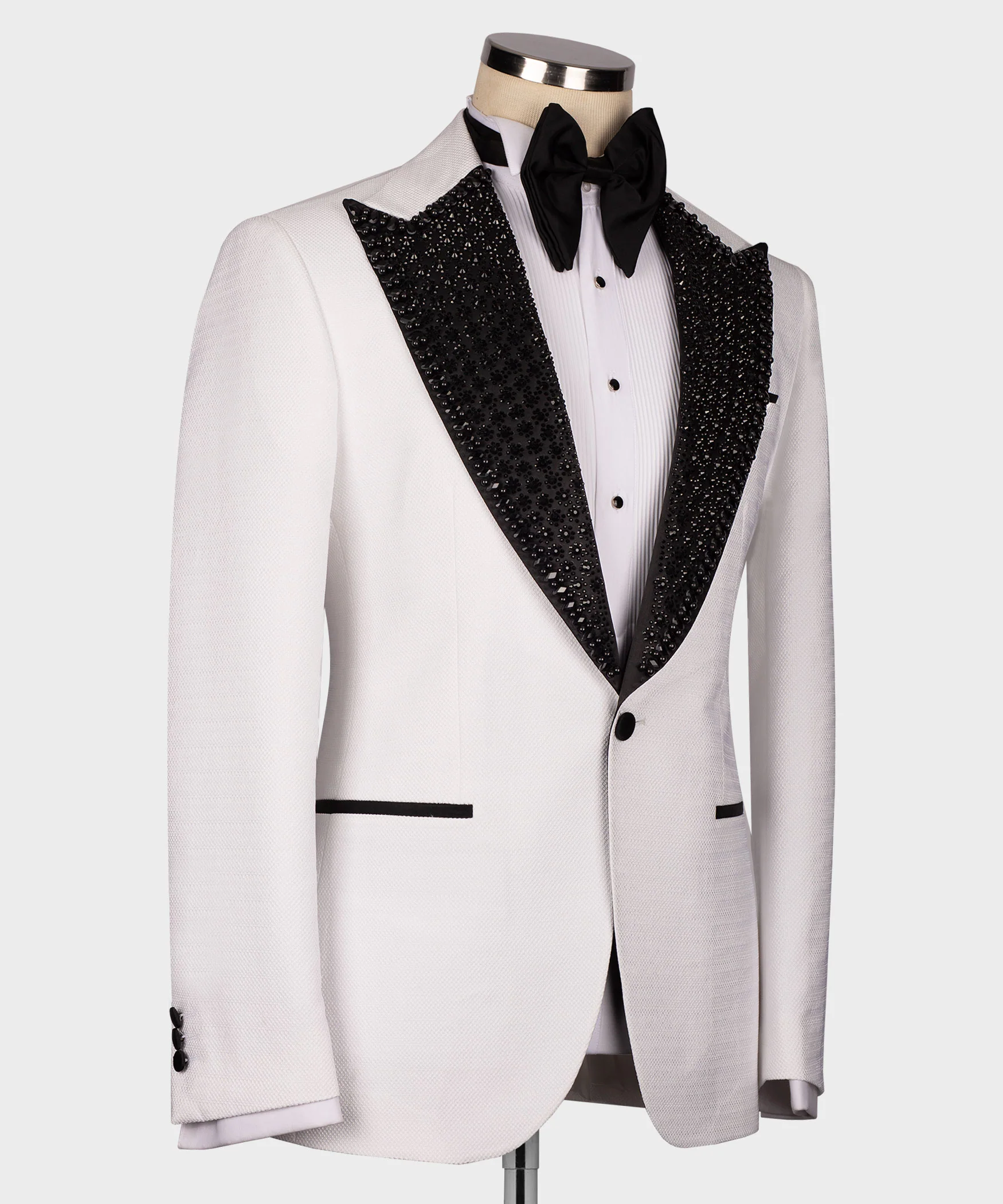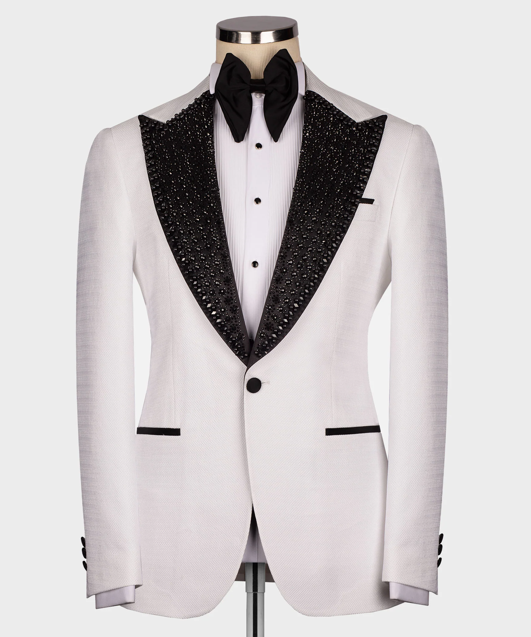 Exclusive custom tuxedos allow you to experience comfort and elegance together. White-Black Gem stone White Tuxedos from SB Suits collections. Made of Silk and Wool with one button, two back Slits, Black tuxedo trousers. Can be made in any size (takes three day) by Custom Orders. Suit contain Jacket, waistcoat and Trousers.