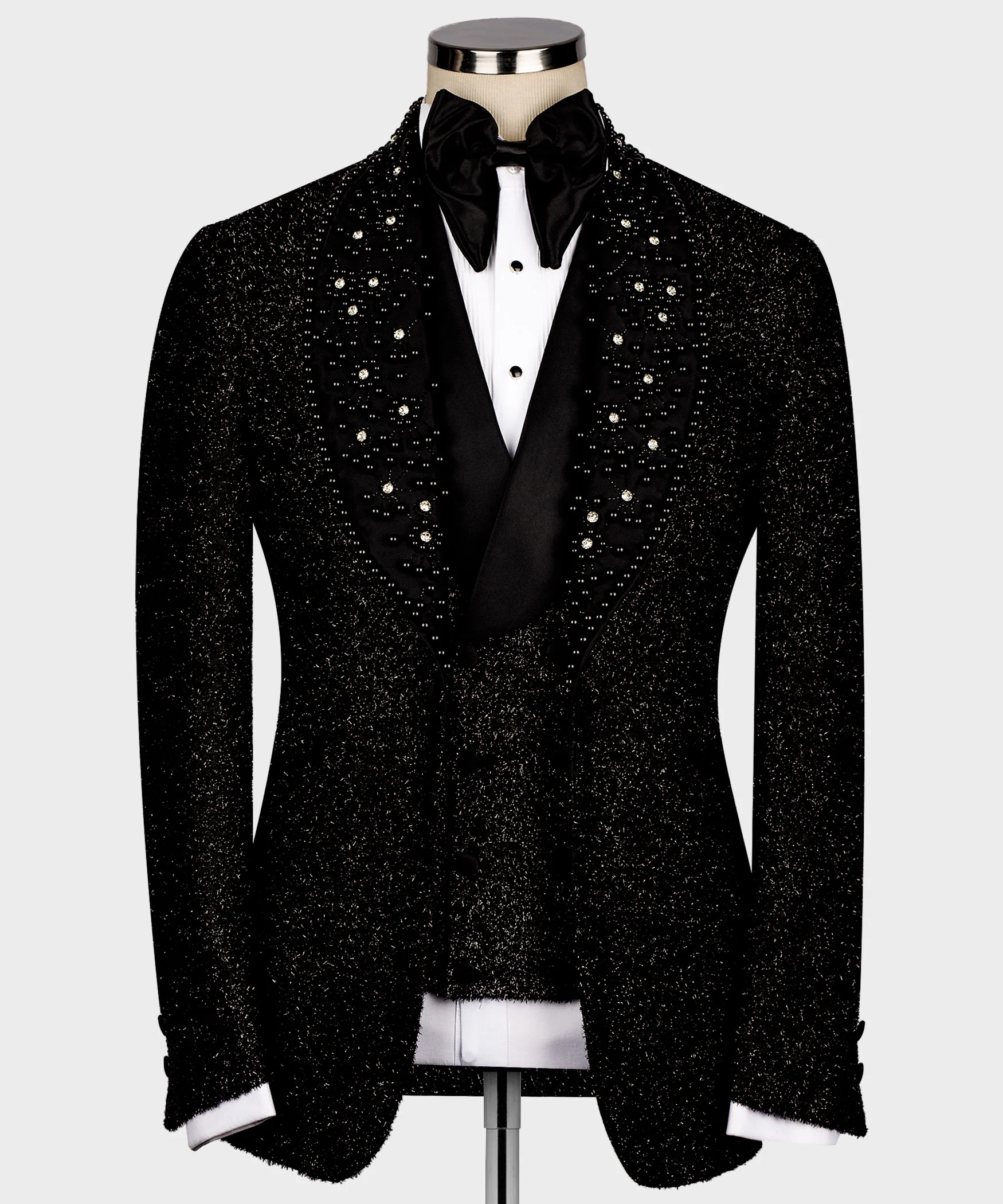Tailor-made tuxedos allow you to experience comfort and elegance together. Tuxedos from SB Suits collections with special stones. Black tuxedo trousers in Silk and Wool with one button fastening and two back vents. It can be made to the desired size (takes five days) by Special Order. The suit includes jacket, vest and pants.